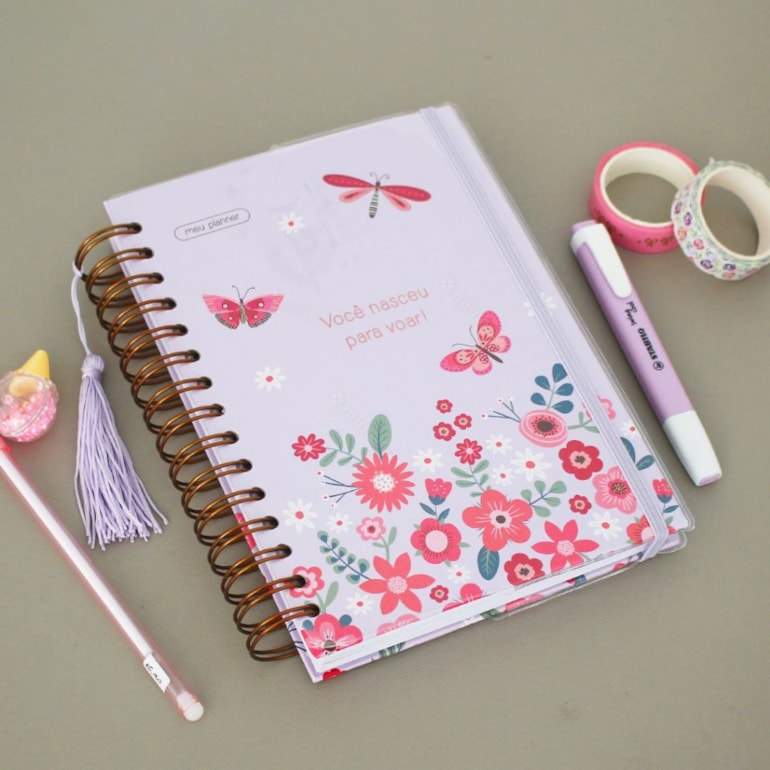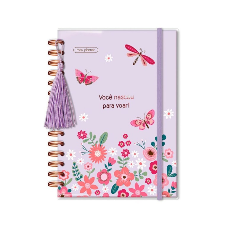 O Planner Permanente Borboletas Médio tem acabamento em espiral metalizada, conta com fechamento em zíper e linda estampa com a frase: “Você nasceu para voar” em fundo lilás decorado com flores e borboletas. Um charme!