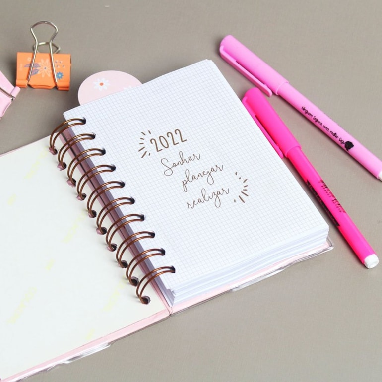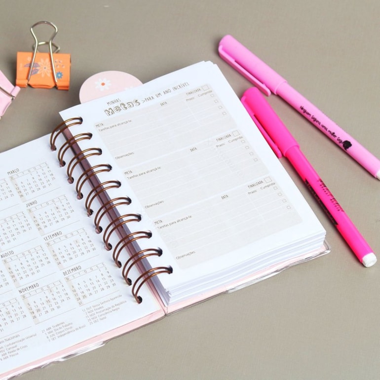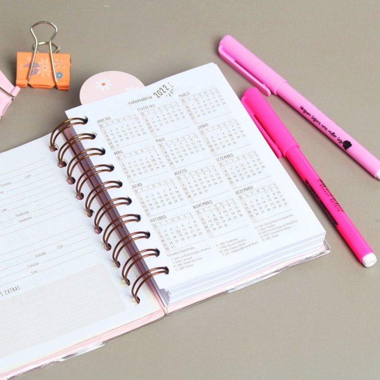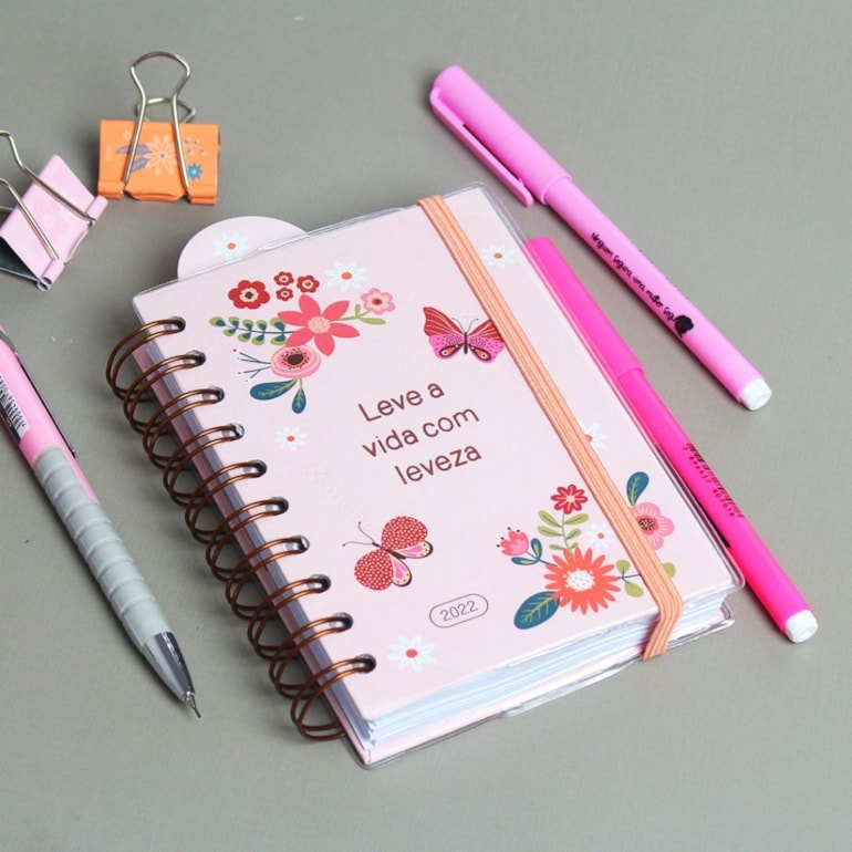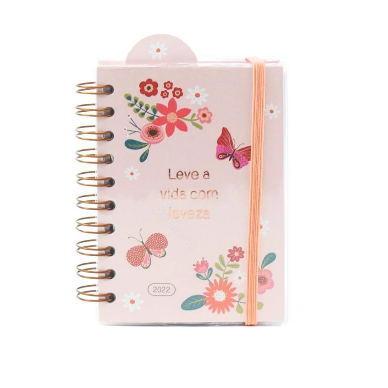 Compacto e completo, este planner tem tamanho pequeno, acabamento em espiral, fechamento em elástico, capa dura e linda estampa com a frase: “Leve a vida com leveza” em fundo rosa decorado com borboletas e flores. Um charme!