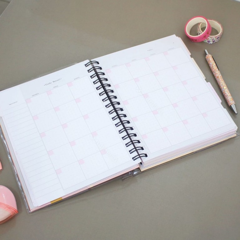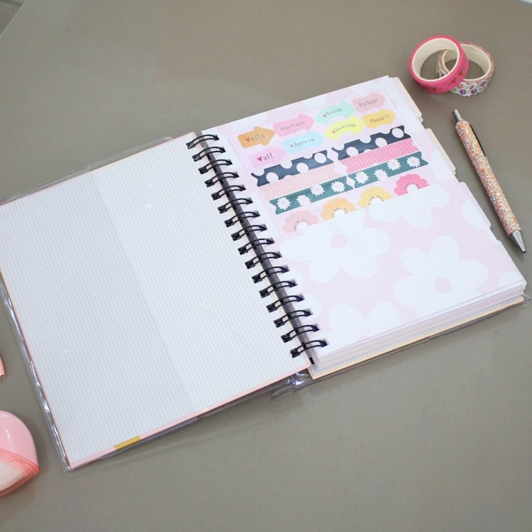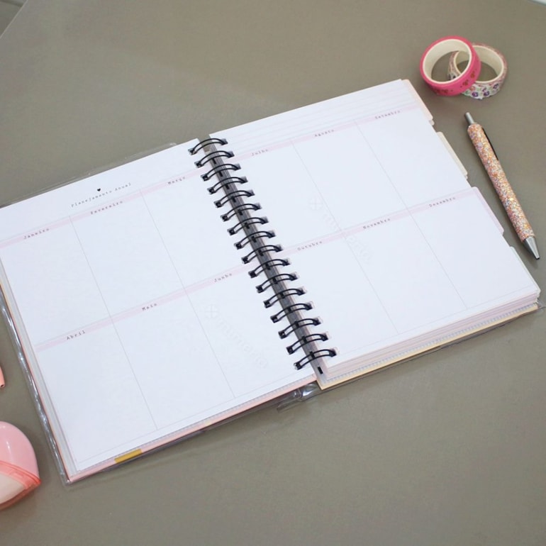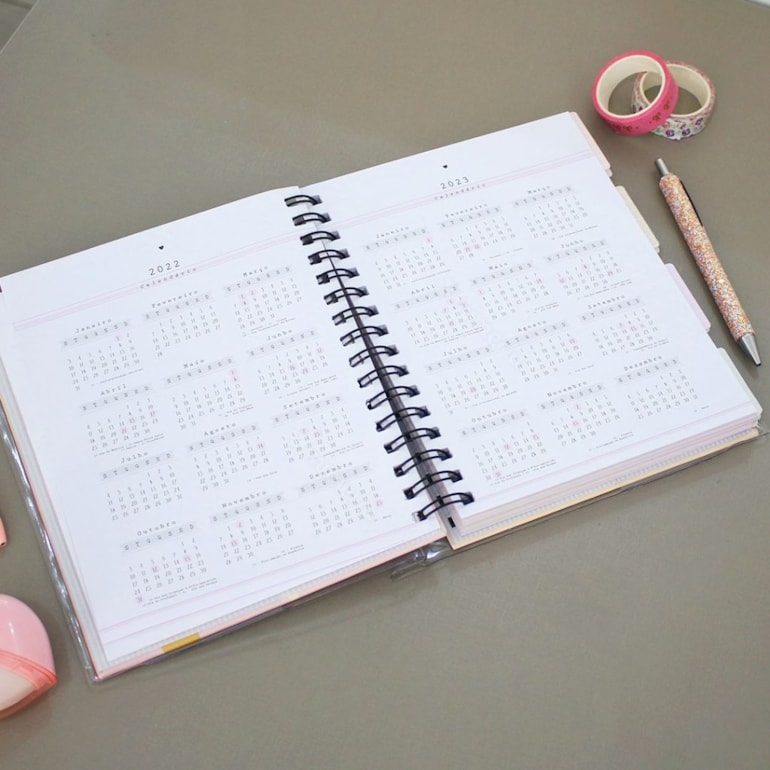 Belíssimo, ele é bastante completinho e tem múltiplas funções para deixar o seu ano completamente alinhado e organizado da maneira mais flexível possível! Ele conta com 12 divisórias coloridinhas, 2 cartelas de adesivos, espaço para finanças mensais, uma lista para prioridades, campo para visão mensal, calendário de 2022 e 2023, além de folhas super espaçosas para organização semanal e diária! Ele possui 192 páginas de pura fofura e vai te encantar com todas as suas funcionalidades!