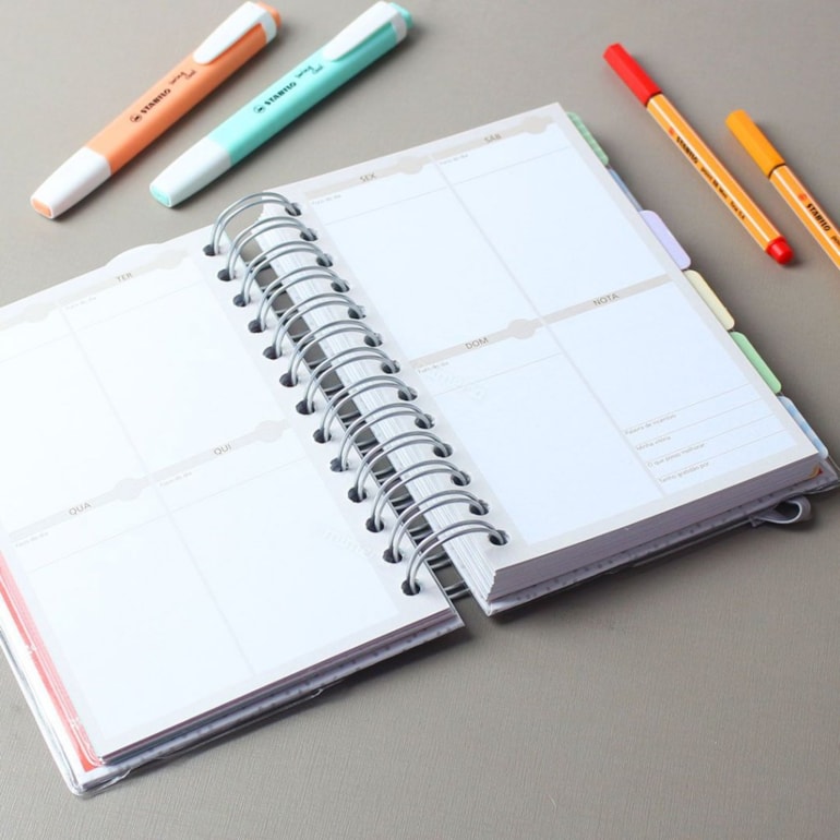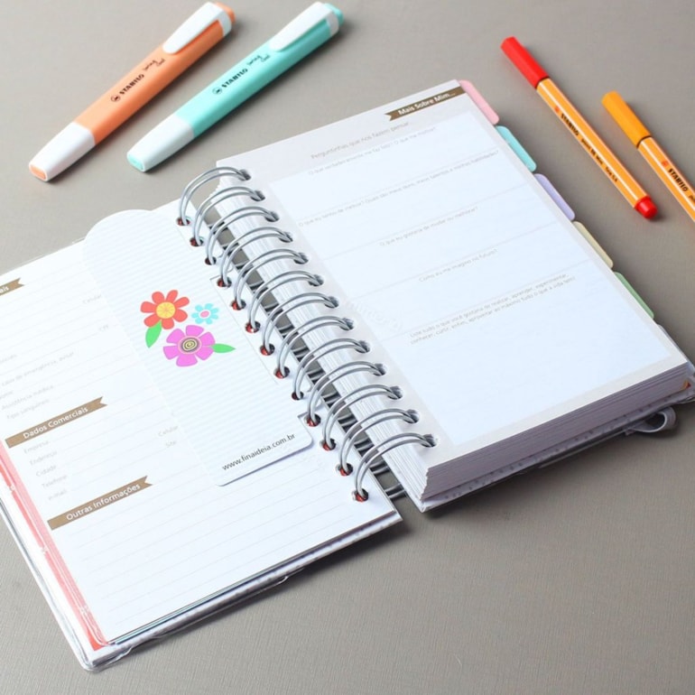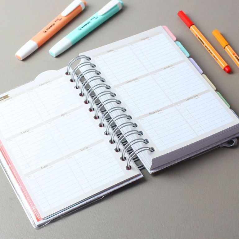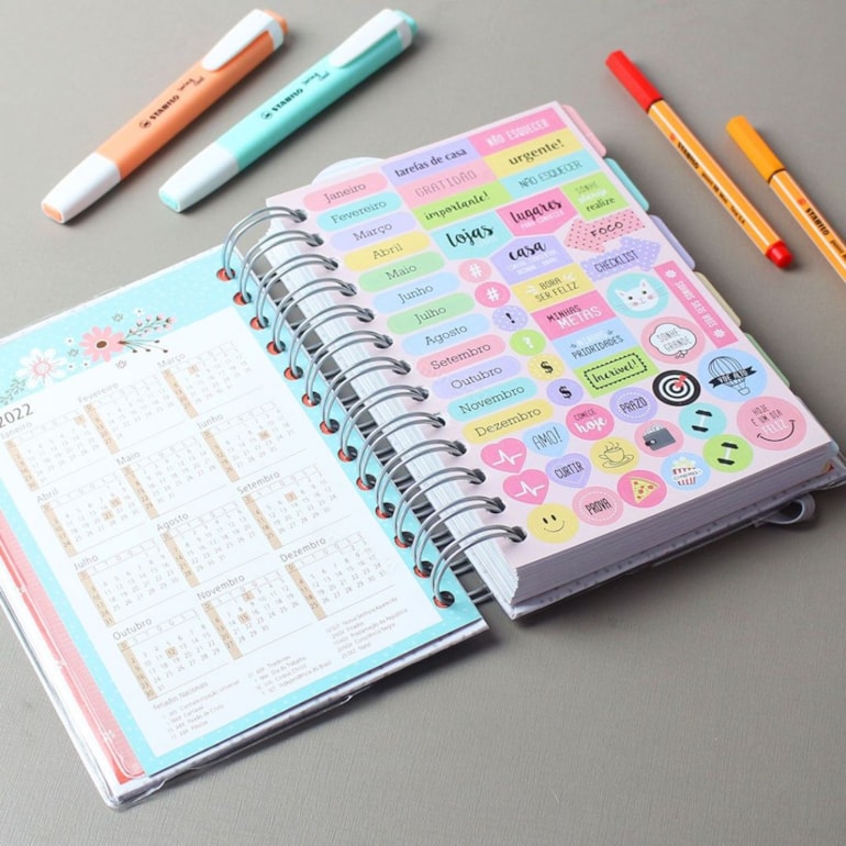 O Planner Permanente Frases Coloridas Pequeno tem miolo completo com envelope plástico, separadores coloridos, cartela de adesivos, páginas de planejamento anual e muito mais. Simplesmente perfeito!