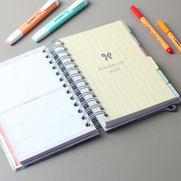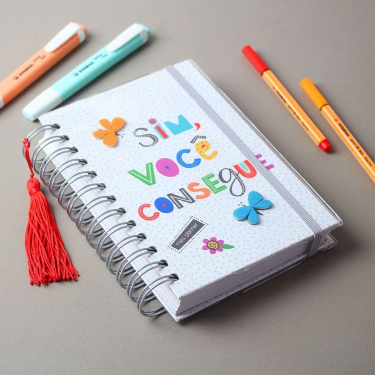 Super fofo, este planner tem capa linda estampada com a frase: “Sim, você consegue” com letras coloridas e aplique de tecido em fundo branco. Um verdadeiro mimo para você usar ou presentear pessoas queridas em datas especiais!