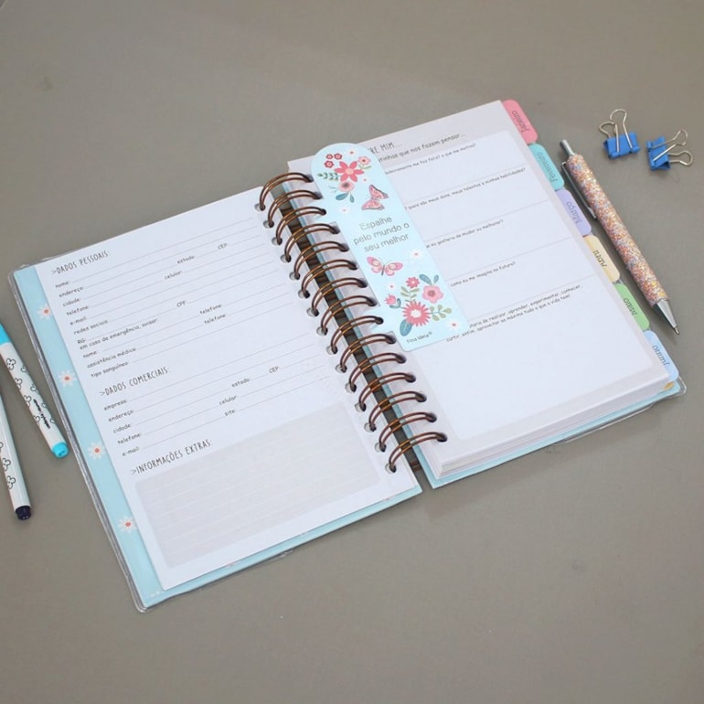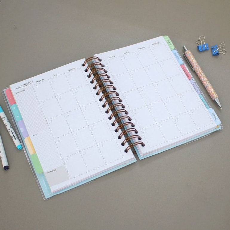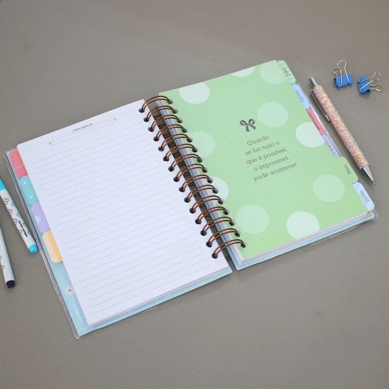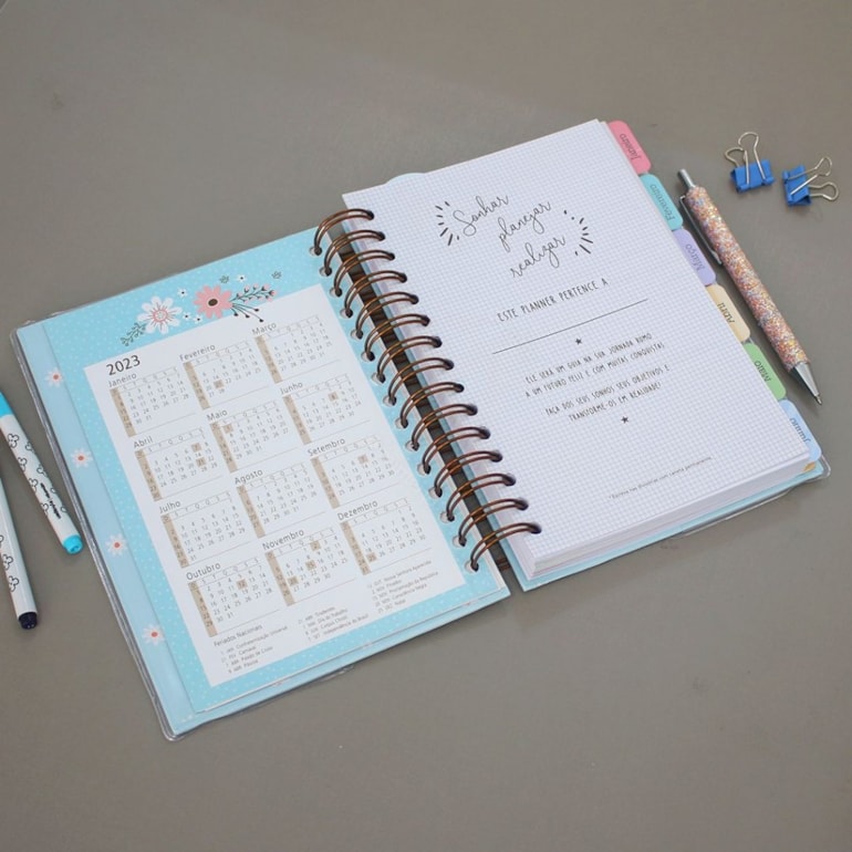 Prático, este planner tem miolo completo com envelope plástico, cartela de adesivos, divisórias coloridas, planner anual, controle financeiro, viagens, monitoramento de hábitos e muito mais. Tudo o que você poderia querer!
