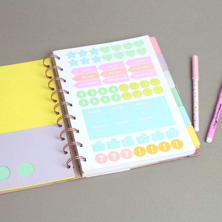 Completo e personalizável, conta com o system flex como principal diferencial, podendo destacar todas as suas folhas quantas vezes quiser, as reposicionando com o encaixe certo logo em seguida! Ele conta ao todo com 2 folhas de adesivo, e 88 folhas de diversos tipos, fechamento através de um elástico, e um porta caneta elástico fixado a lateral da sua capa!
