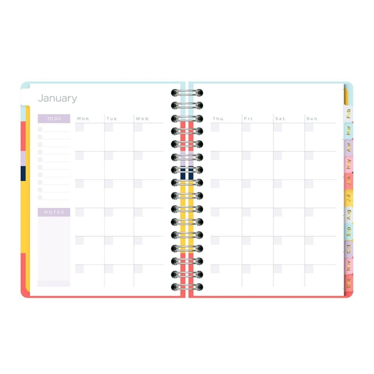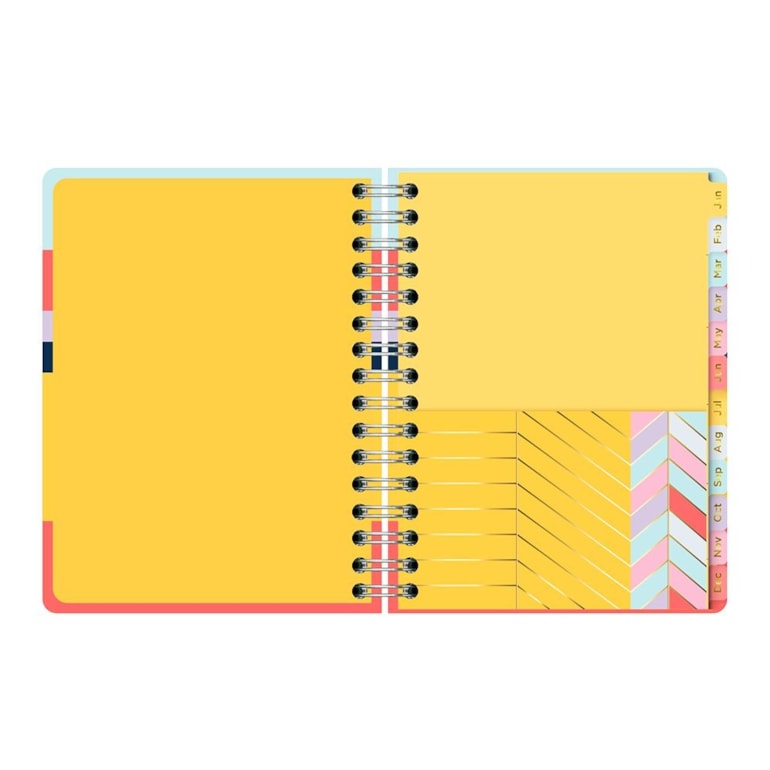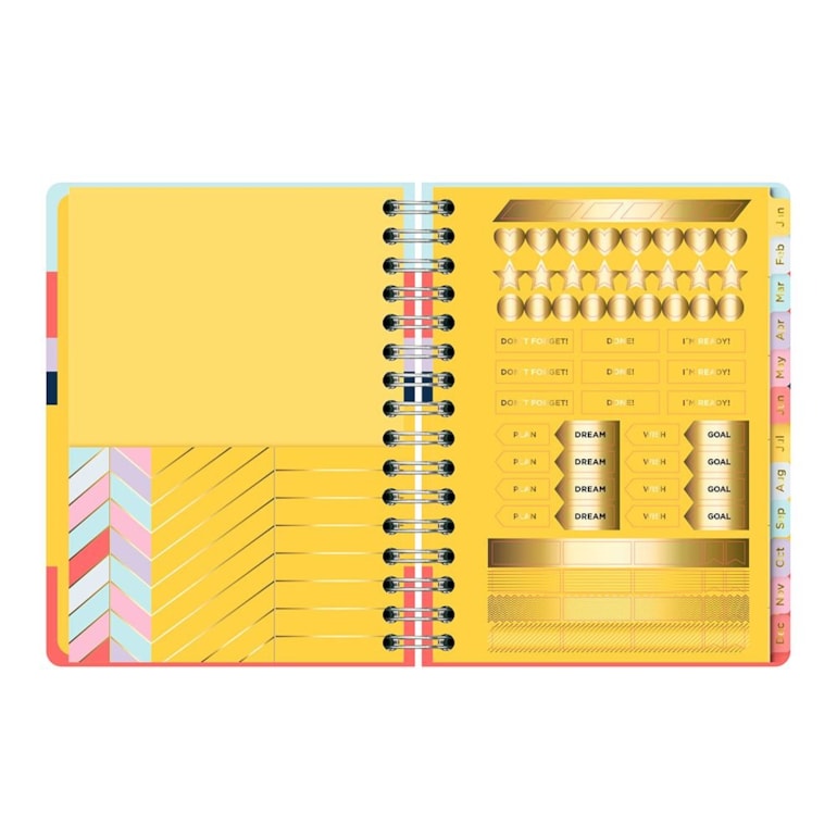 Cheio de detalhes, este planner vem com 12 divisórias coloridas (uma para cada mês), 72 folhas divididas em planejamento mensal e semanal, 1 envelope de papel e 2 cartelas de adesivos para você organizar e colorir suas anotações.