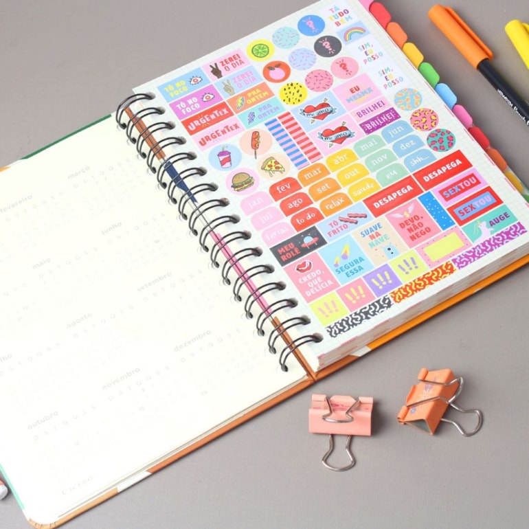 Com 96 folhas em papel pólen, ele possui uma cartela de adesivos, 12 divisórias, uma folha de calendário, uma bolsa pasta para organizar seus papeis avulsos, visão anual e semanal, e por último uma parte crucial, que é projetada para checagem de tudo o que você conseguiu fazer durante a passagem dos meses!