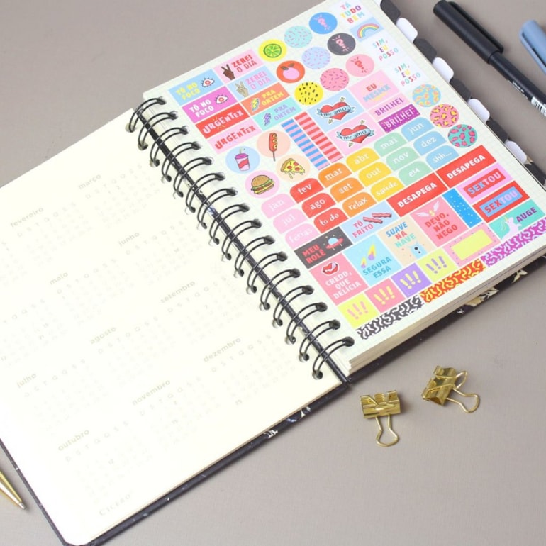 Com 96 folhas em papel pólen, ele possui uma cartela de adesivos, 12 divisórias, uma folha de calendário, uma bolsa pasta para organizar seus papeis avulsos, visão anual e semanal, e por último uma parte para checagem de tudo o que você conseguiu fazer durante a passagem dos meses!