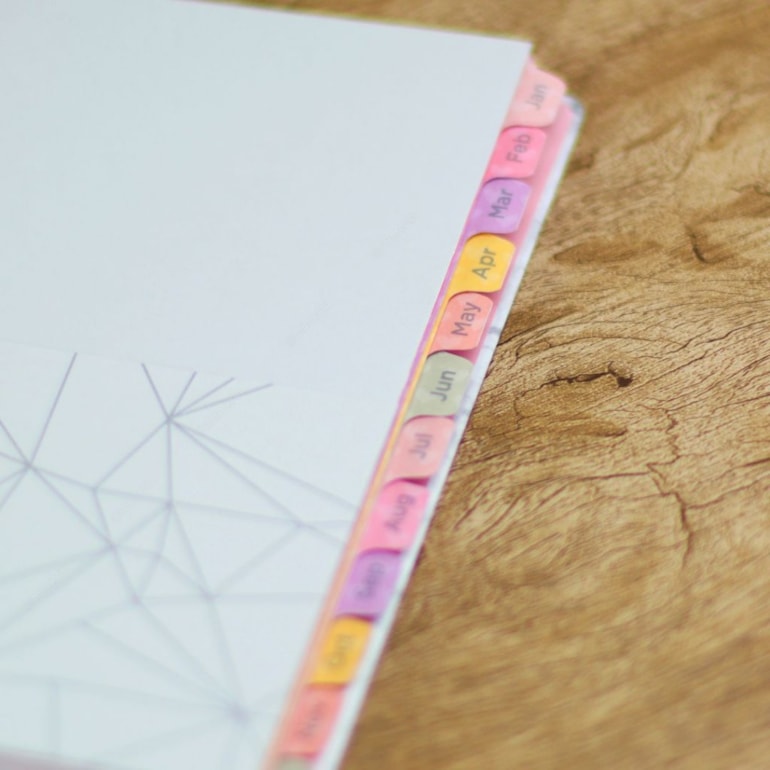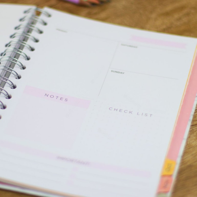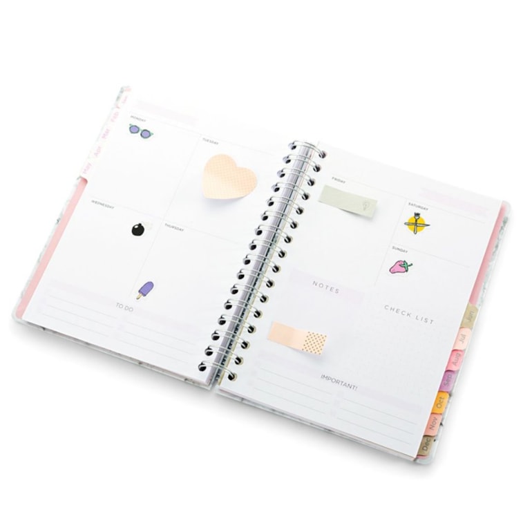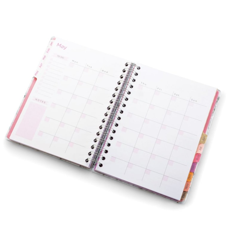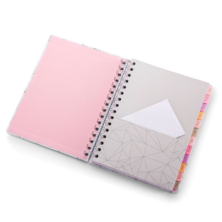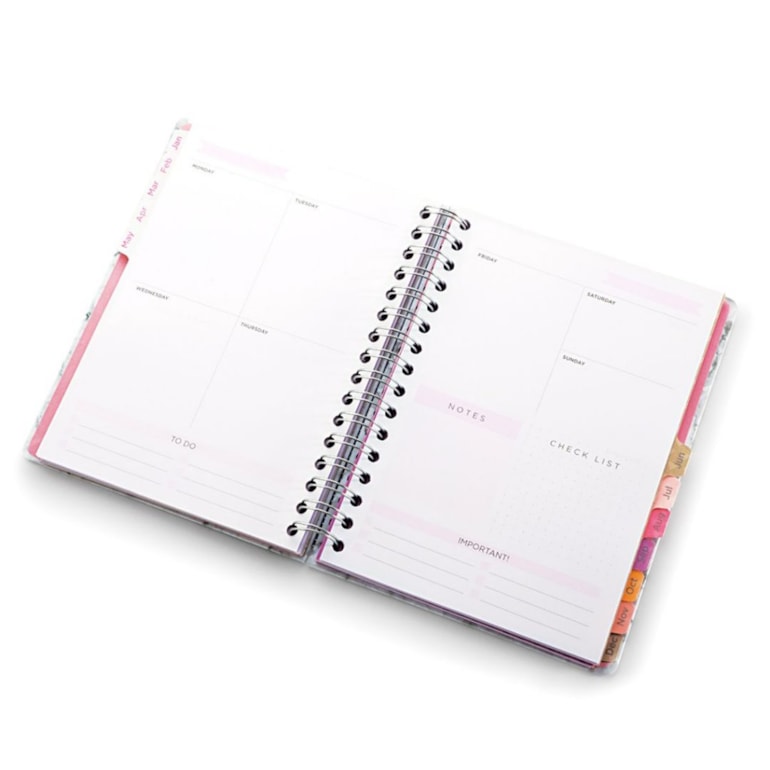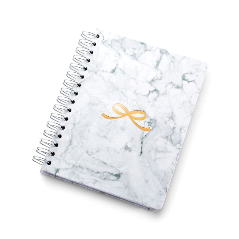 Lindo, este planner tem acabamento em wire-o e capa dura estampada com um laço dourado em fundo que imita mármore. Além disso, conta com miolo completo com folhas para planejamento mensal e semanal. Um verdadeiro mimo!