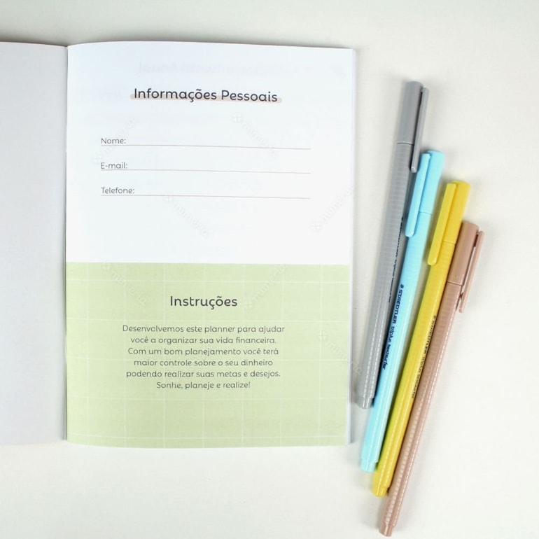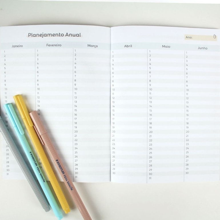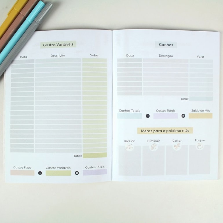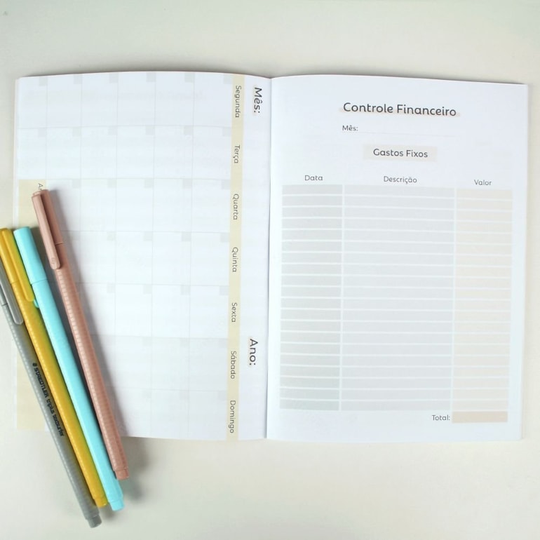 Com miolo completo, este planner vem com páginas para planejamento anual e mensal, controle financeiro com campos para gastos fixos e variáveis, páginas para metas, poupança e anotações. Tudo o que você poderia querer!