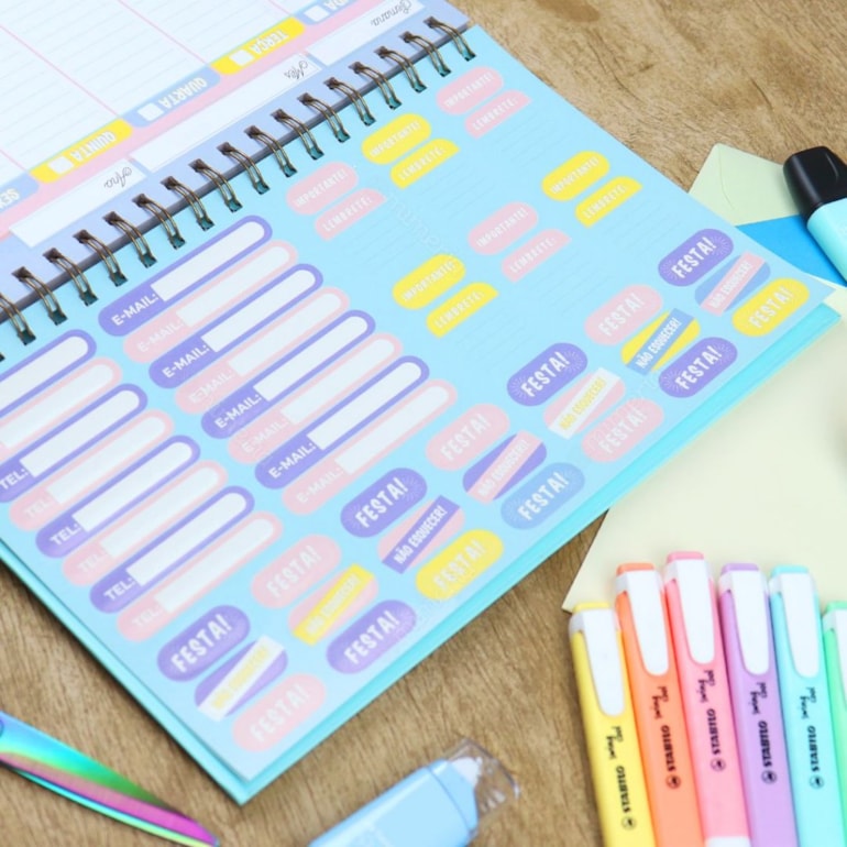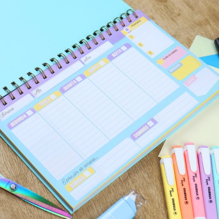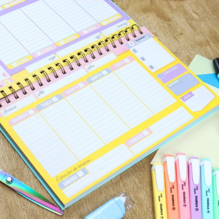 O Planner Semanal Me Organiza é o produto perfeito para você estar sempre em dia com seus compromissos, sem nunca se esquecer de nada. Muito fofinho com estampa colorida, esse planner conta com espaço para anotar suas responsabilidades em cada dia da semana, além de espaço para suas prioridades, planejamentos e outras anotações.