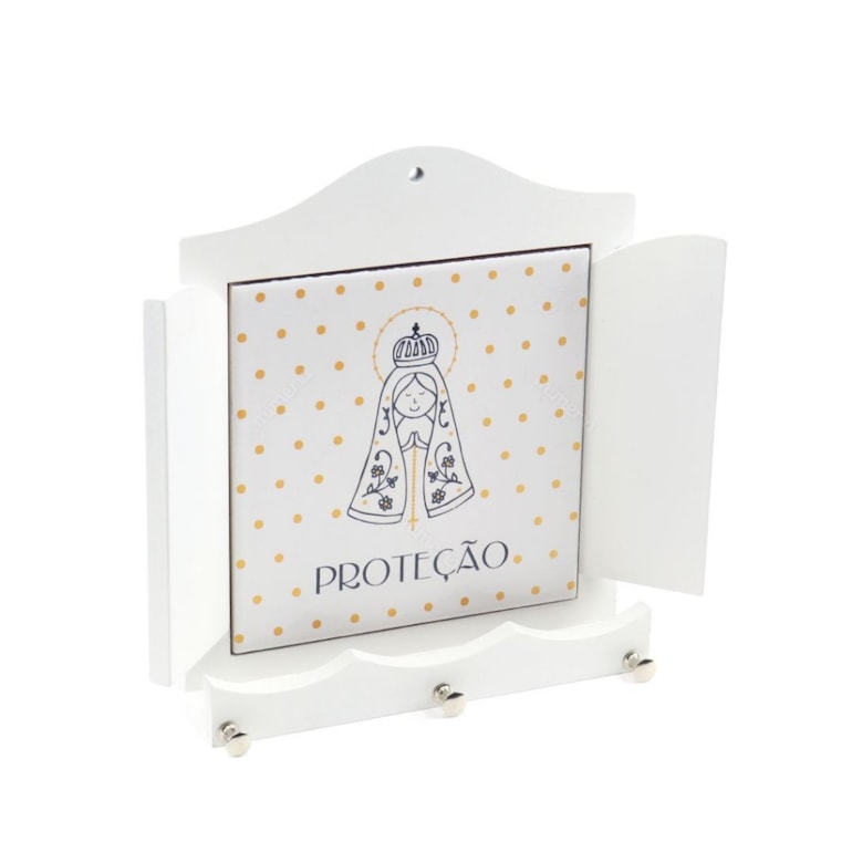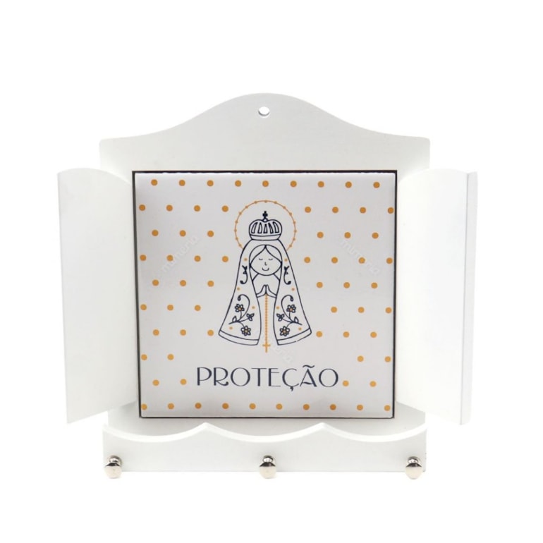 Maravilhoso, este porta-chaves tem formato de um altar e linda estampa da Virgem Maria e da palavra: “Proteção” em fundo branco com poás douradas. Um charme!
