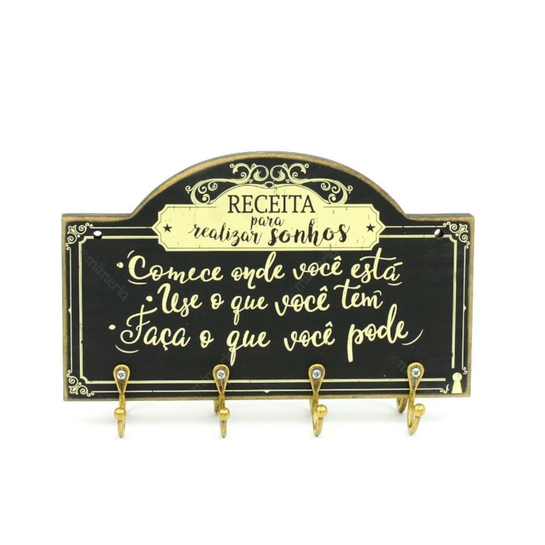 Esse lindo Porta Chaves Receitas é muito encantador. Perfeito para pendurar na entrada da sua casa, consultório ou escritório e deixar o ambiente muito mais charmoso. Estampado no estilo rústico com o fundo preto vem com a frase: "Receita para realizar sonhos: comece onde você está; use o que você tem; faça o que você pode". Muito lindo e inspirador, não é mesmo?!