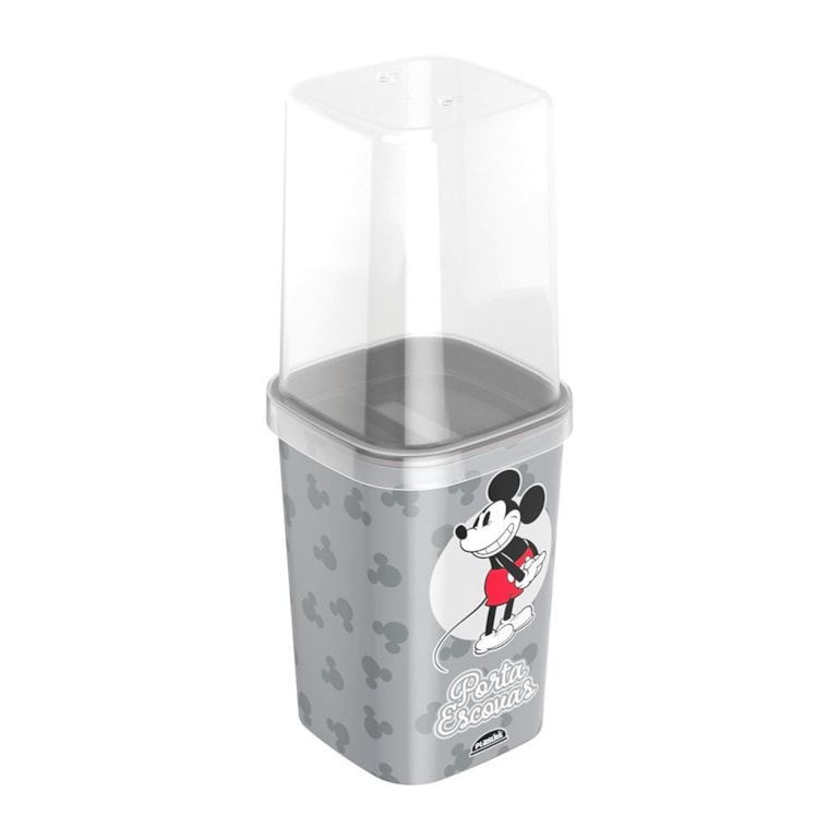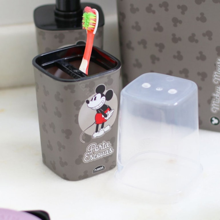 Ele tem espaço para colocar a sua escova de dente e a da família também, além disso, o design é mega fofo, inspirado no Mickey Mouse, conta com fundo cinza, estampado com esse ratinho simpático e querido.