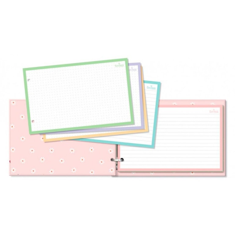 Lindinho, este porta-ficha vem estampado com margaridas em fundo lilás e conta com 50 fichas de bordas coloridas. Ideal para combinar com outros mimos de papelaria da mesma coleção!