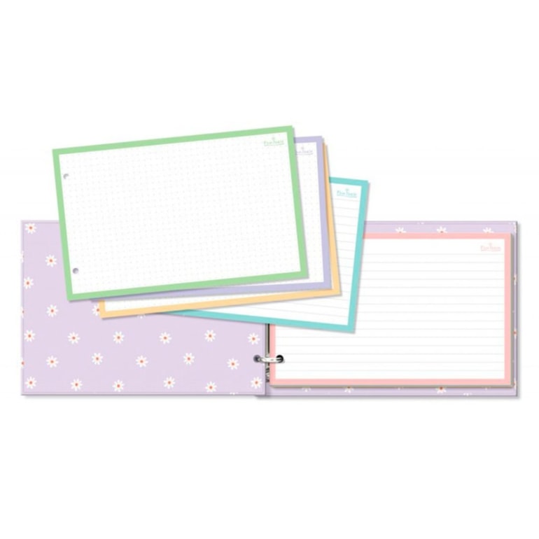 Lindinho, este porta-ficha vem estampado com margaridas em fundo lilás e conta com 50 fichas de bordas coloridas. Ideal para combinar com outros mimos de papelaria da mesma coleção!