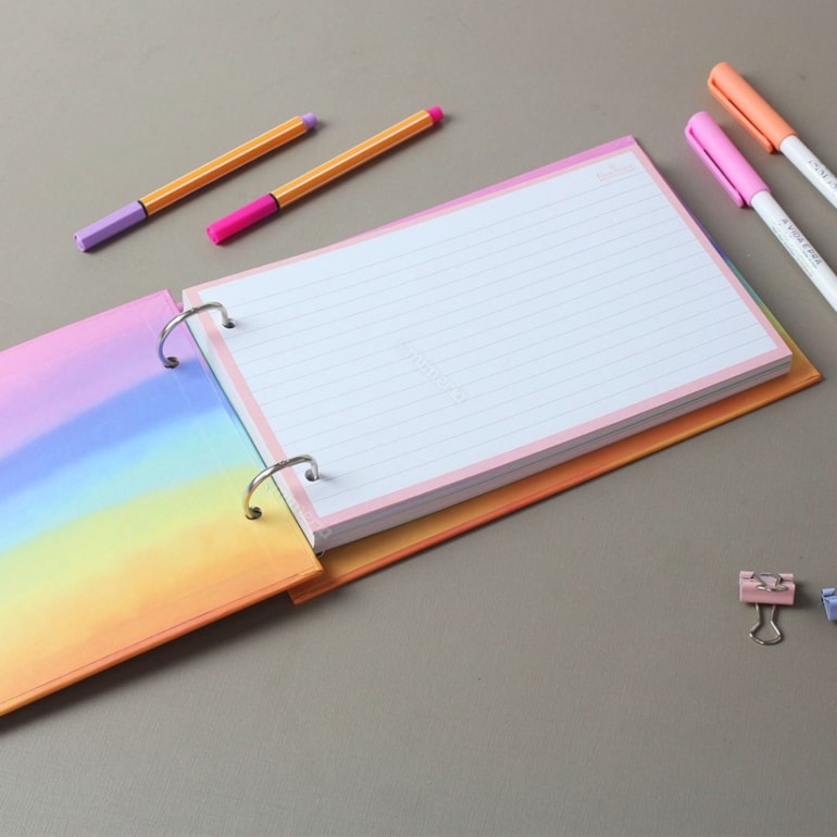 Prático, este porta-fichas vem com folhas pautadas e pontilhadas com bordas coloridas. Ideal para fazer anotações, desenhos, mapas mentais, resumos e tudo o que você precisar!