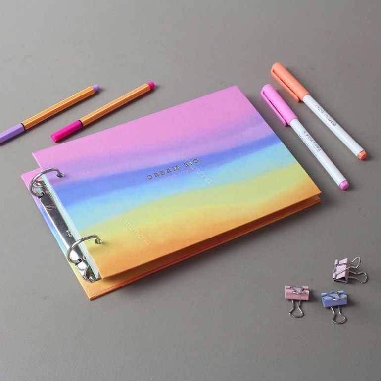 O Porta-Fichas Tie Dye além de usual tem linda estampa da frase: “Dream big” com letras douradas em fundo tie dye. Um mimo lindo e super alto astral para você usar ou presentear pessoas queridas apaixonadas por papelaria criativa.