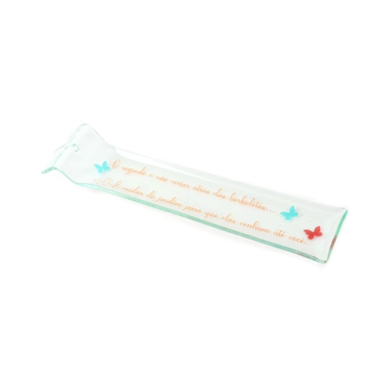 Transparente e confeccionado com vidro, ele apresenta borboletas estampadas e uma frase inspiradora com uma escrita linda e criativa: “O segredo é não correr atrás das borboletas... É cuidar do jardim para que elas venham até você”. Perfeito, né?!