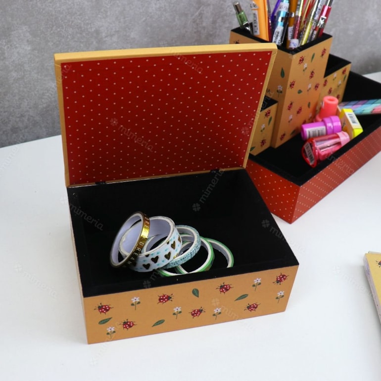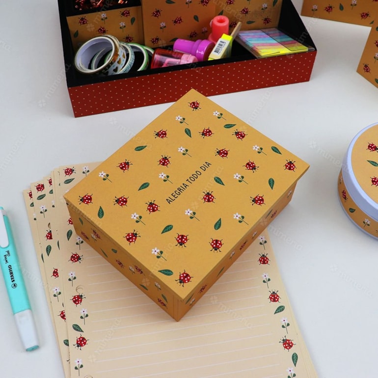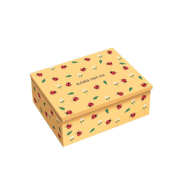 Ele é revestido em MDF, apresenta fundo mostarda, com joaninhas e flores estampadas. Uma gracinha né? A parte interna é confeccionada com camurça, o que confere delicadeza ao produto.