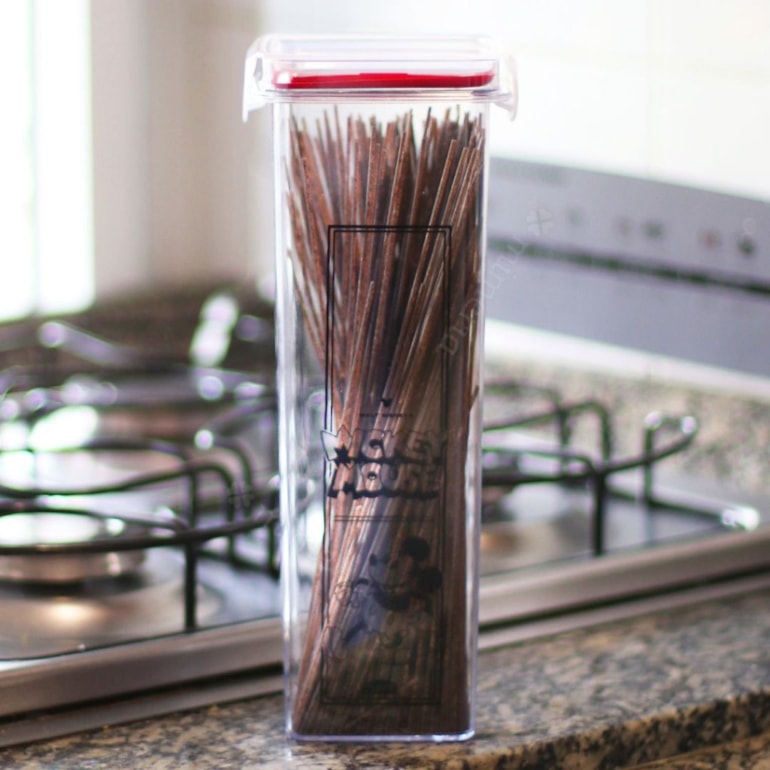 O Porta Mantimentos Hermético Quadrado Trava Mais Mickey Mouse 1,6 Litros é ideal para guardar massa de macarrão, ravioli, grãos, biscoitos, marshmallows e muito s. Tudo isso com muita segurança, já que o produto é livre de BPA, substância tóxica que alguns tipos de plástico têm.