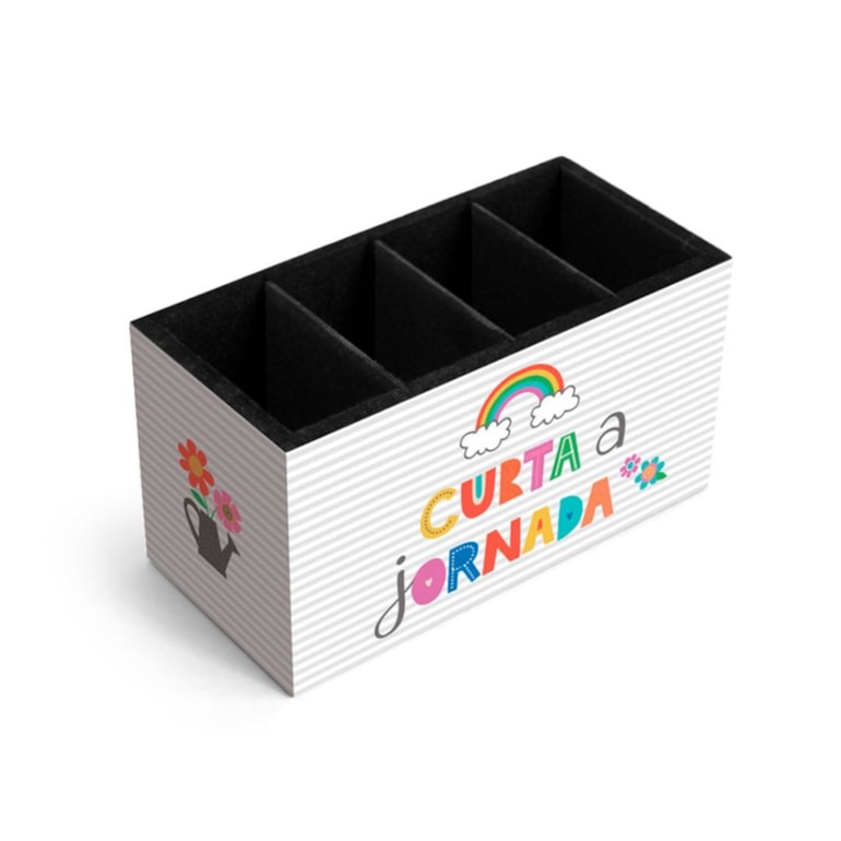 Super fofo, este porta-trecos tem revestimento em papel couchê estampado com a frase: “Curta a jornada” em letras coloridas, fundo branco e detalhes de flores e arco-íris. Um verdadeiro mimo!