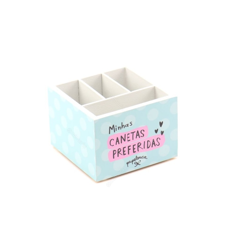 Produzido em MDF e com design super criativo e cheio de humor, esta caixinha é super prática, conta com quatro divisórias e vem estampada com a frase: “Minhas Canetas Preferidas" em fundo azul. Um verdadeiro mimo!