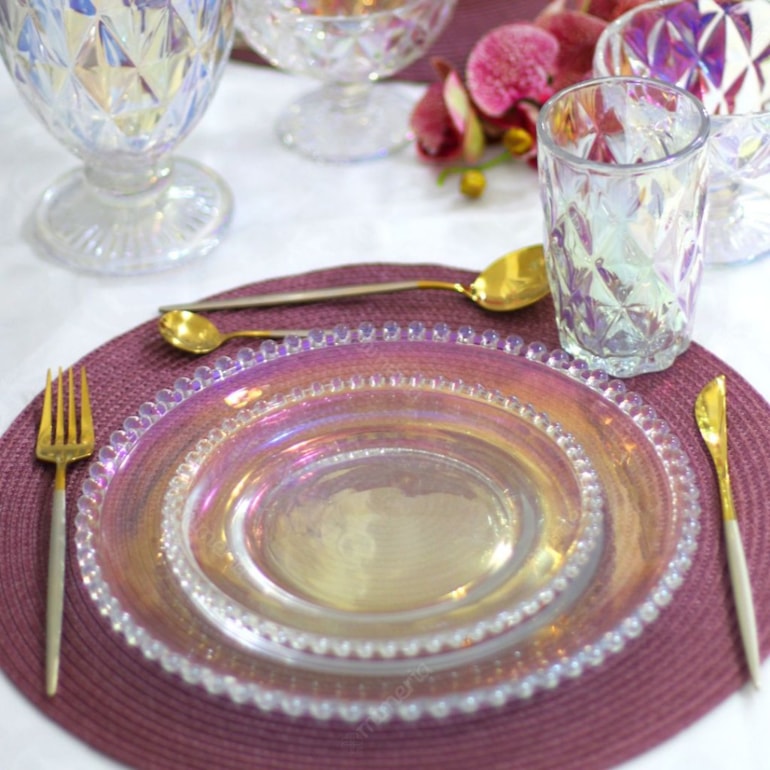 Produzido em crital de chumbo de alta qualidade, o Prato Raso de Cristal de Chumbo Pearl Rainbow Furta Cor Bolinhas tem uma espessura e uma resistência maiores, o que o torna muito mais durável. Com transparência e cor furta cor maravilhosa, tem uma um borda super charmosa cheia de bolinhas. Prato perfeito para deixar suas comemorações e datas festivas um arraso. Combine-o com um jogo americano lindo!