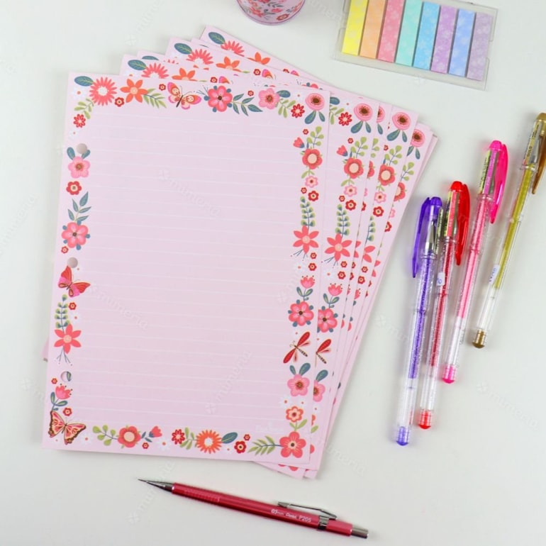 Ele conta com 30 folhas pautadas, com 3 furos nas laterais, estampas de borboletas e flores diversas, além do lindo tom rosa que pigmenta as folhas.