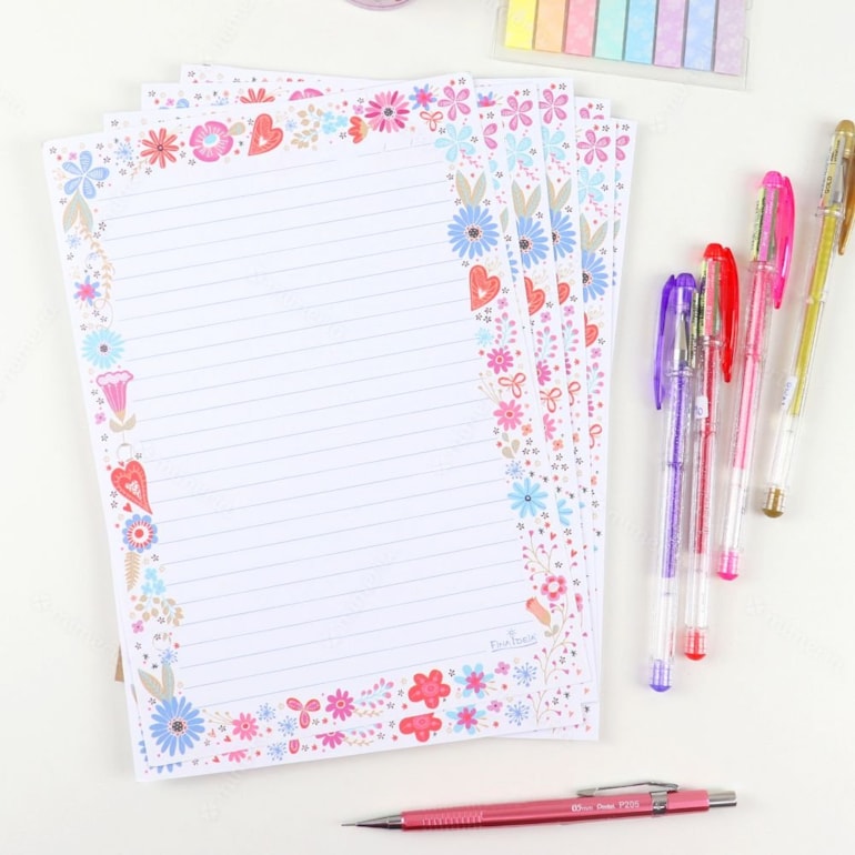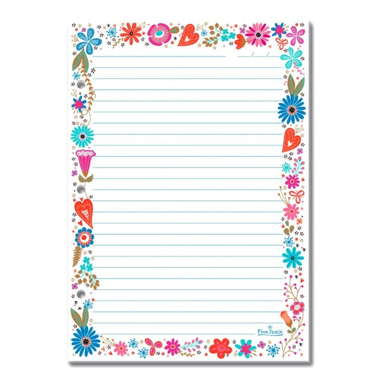 Perfeito para repor as folhas do caderno e planner argolados, ele conta com 3 furos nas laterais, ótimos para o encaixe. Vem com 30 folhas pautadas e estampas ao lado, com flores diversas e alguns corações.