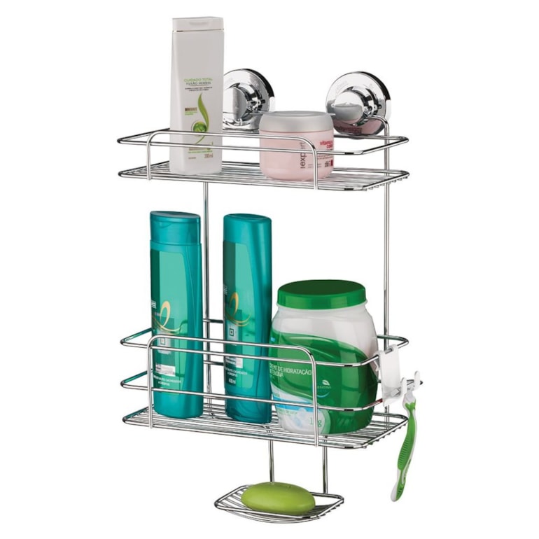 Produzido em aço carbono, tem tecnologia rust free, que garante uma proteção até 5 vezes maior contra a ferrugem, preservando ao máximo a vida útil e agregando maior qualidade a sua peça! Ele conta com dois andares, uma saboneteira, ganchinhos nas laterais para colocar aparelho de barbear e ainda vem com grades de proteção em suas prateleiras!