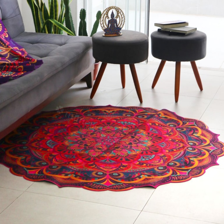 Perfeito para você decorar o hall de entrada do seu apartamento ou da sua casa, sala, quarto, varanda, na recepção da clínica ou escritório ou no seu cantinho de yoga ou meditação. O Tapete Mandala Laranja, Salmão e Rosa é lindíssimo, além de harmonizar seu ambiente, só vai levá-lo boas energias. Um encanto!