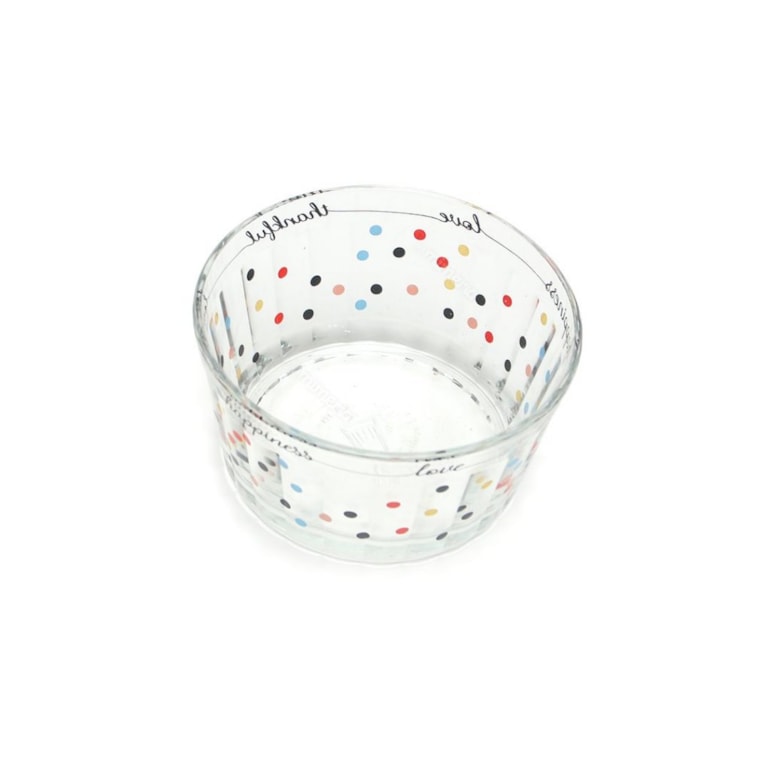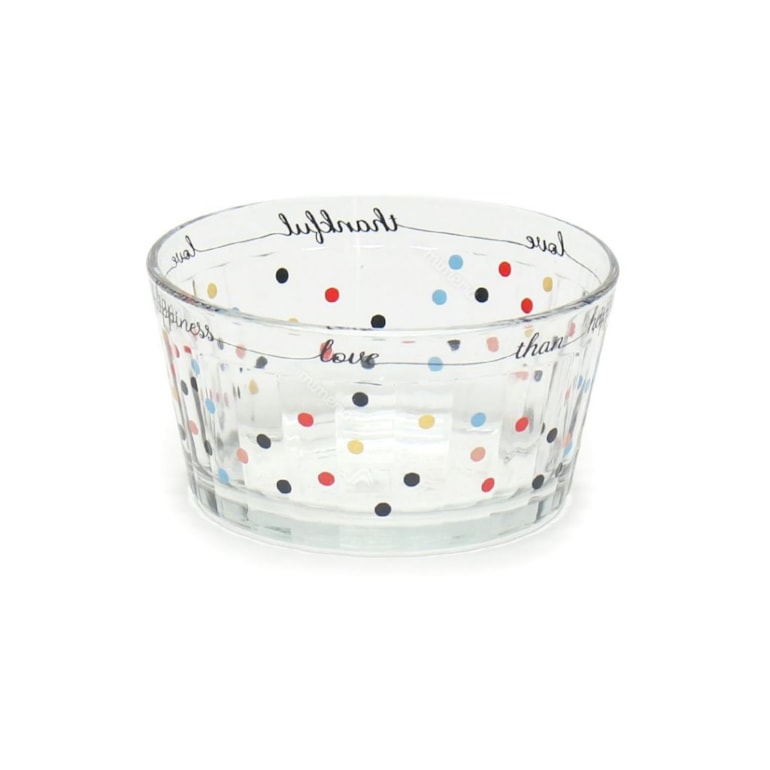 Fofíssima, esta tigela tem estampa de bolinhas coloridas e das palavras: “love”, “happiness” e “thankful” em fundo transparente. Um super mimo para presentear pessoas queridas em chás de cozinha e afins.